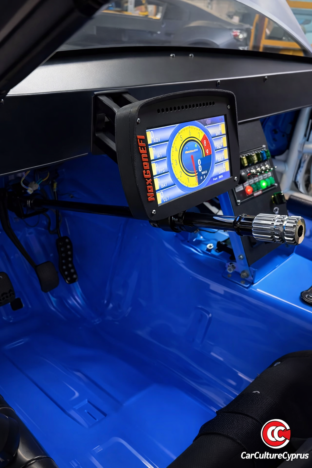 Upgrade your race car cockpit with this custom steering column–mounted bracket designed for NexGen EFI displays.