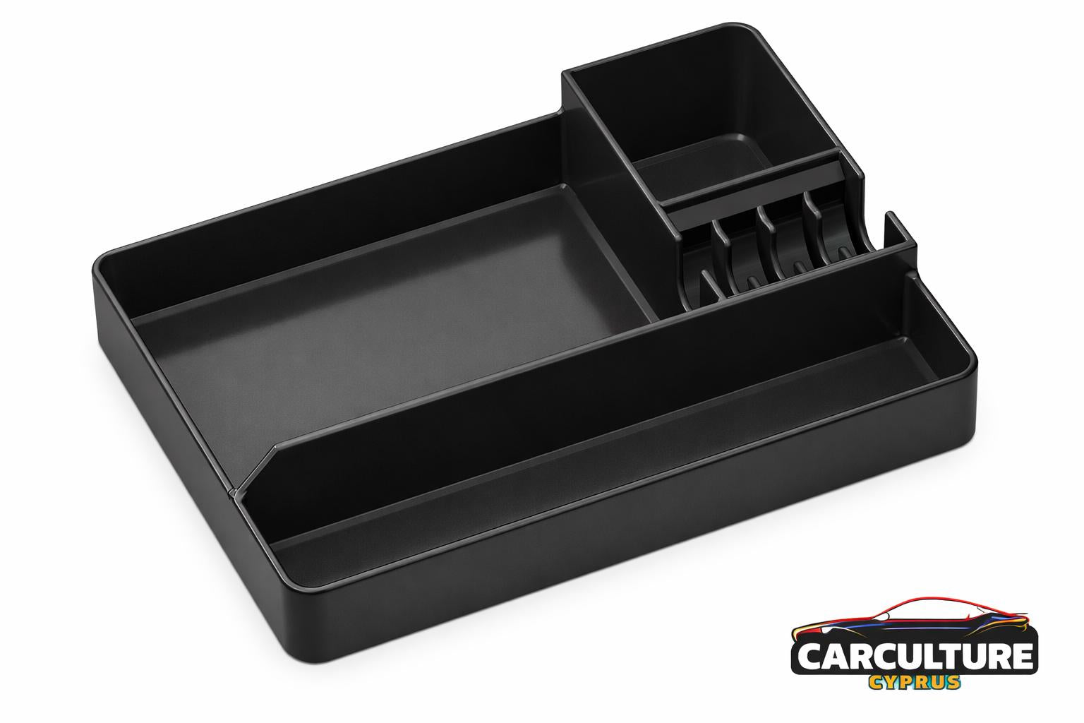 This tray insert fits inside the factory center armrest and installs in seconds — no drilling, no permanent modification.