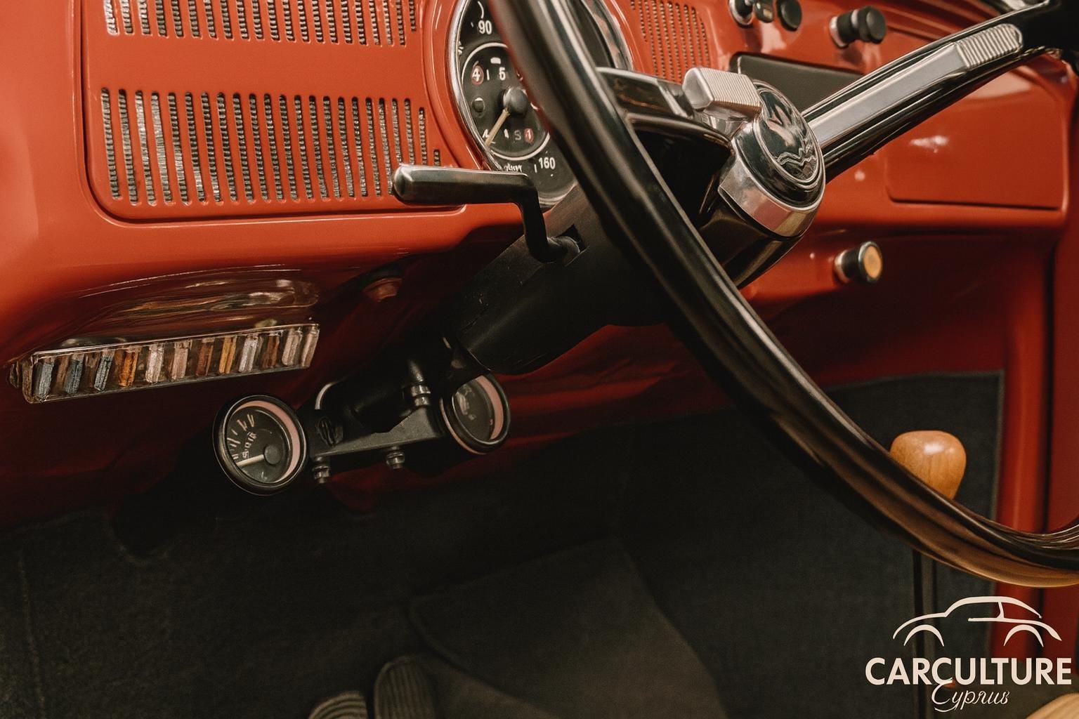 Custom gauge bracket designed specifically for the classic VW Beetle. This support mounts directly on the steering column and can hold two 52mm (2 1/16") gauges, such as boost, oil pressure, temperature, or AFR.